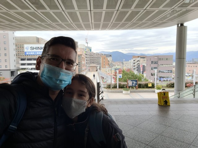 Falnivaló apa-lánya csoport, háttérben Naganoval és az azt körbevevő hegyekkel.