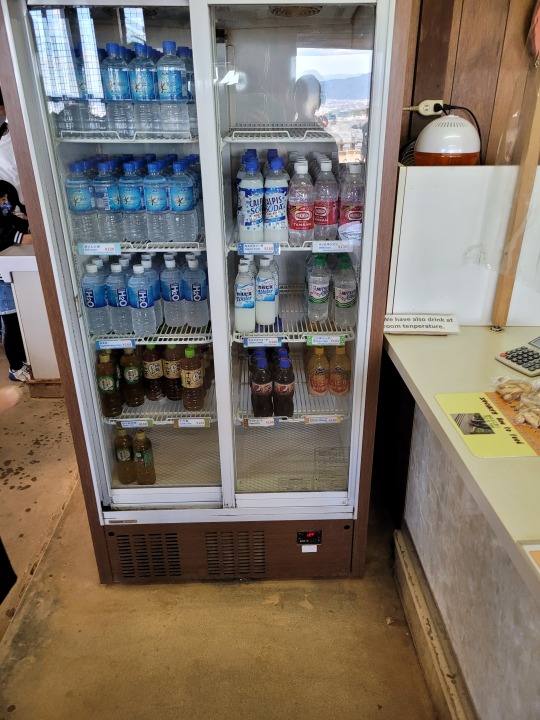 Ez az etetőházi italkínálat jobb oldalon középen a fergeteges tejsav üditővel. Mellette a pultnál lehetett vásárolni mogyorót és banánkarikákat (100 yen) az etetéshez.
