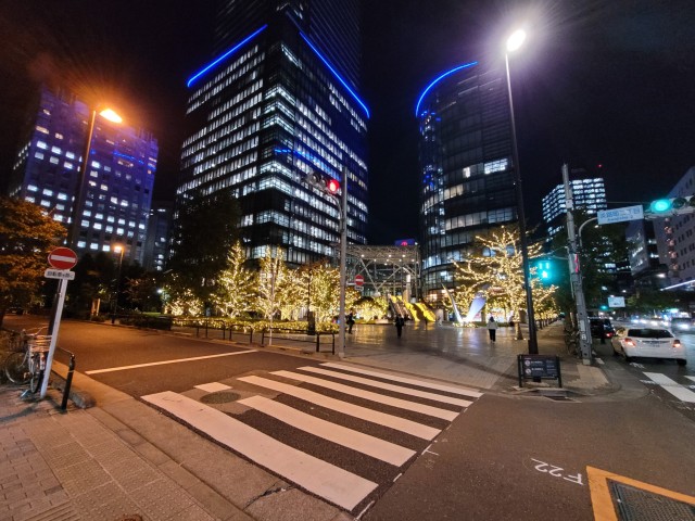 Irodaház / pláza, előtte a karácsonyi kivilágítás.