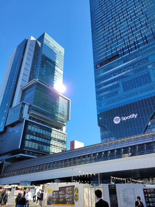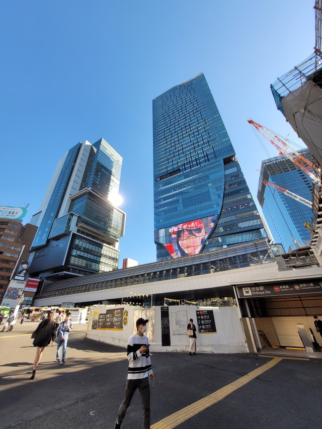 Két toronyház néhány méterrel arrébb. A bal oldaliba, a Hikorie galériának is otthon adóba (rajta a felirat) igyekszünk, mert neten kifigyeltem, hogy ide ingyen be lehet jutni és a sokadik emeletről szuper rálátás van a Shibuya crossingra.